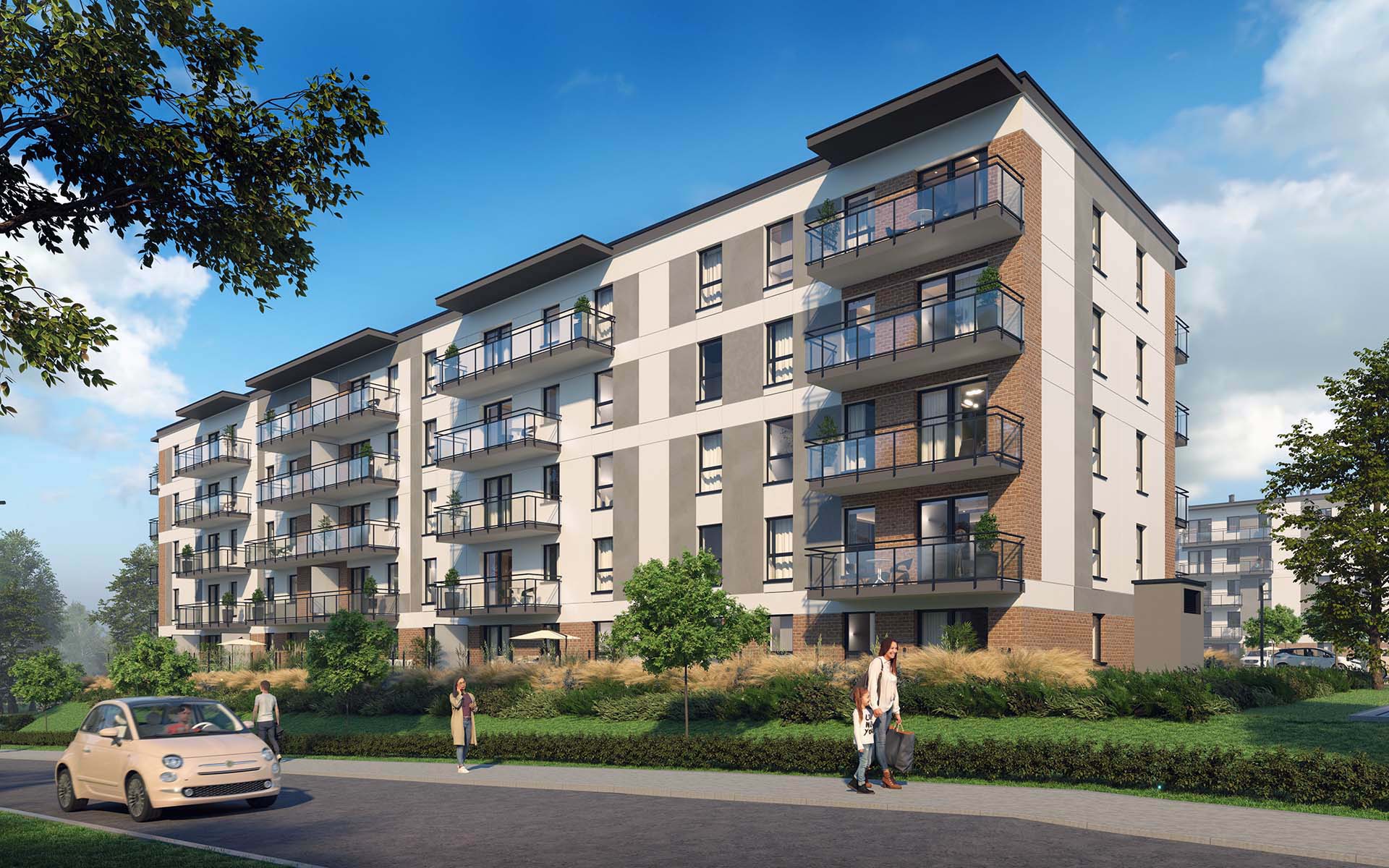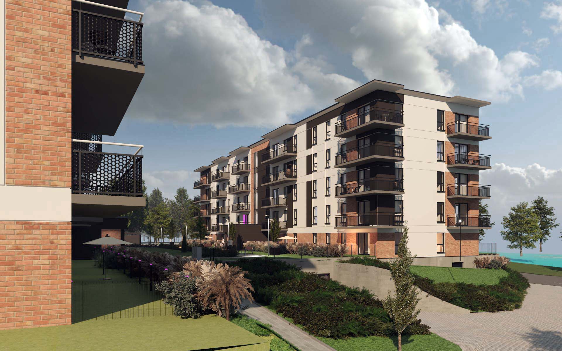Aktualnie rozpoczęliśmy budowę pierwszego budynku z windą i garażem podziemnym, a w nim łącznie 55 mieszkań o zróżnicowanych metrażach od 30 m2 do 67 m2. Każde mieszkanie posiada przynależną do lokalu komórkę lokatorską oraz duży balkon lub ogródek (parter).